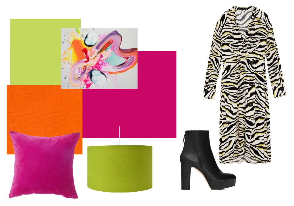 Bland derfor inn roligere, ensfargede plagg som sort og off white. Det er likevel ikke noe i veien å kombinere med friskere og sterkere farger for å skape wow-effekt. Årets interiørtrender er fargesterke, og en kombinasjon av knallrosa, oransje og lime, er perfekt sammen med dyreprint.