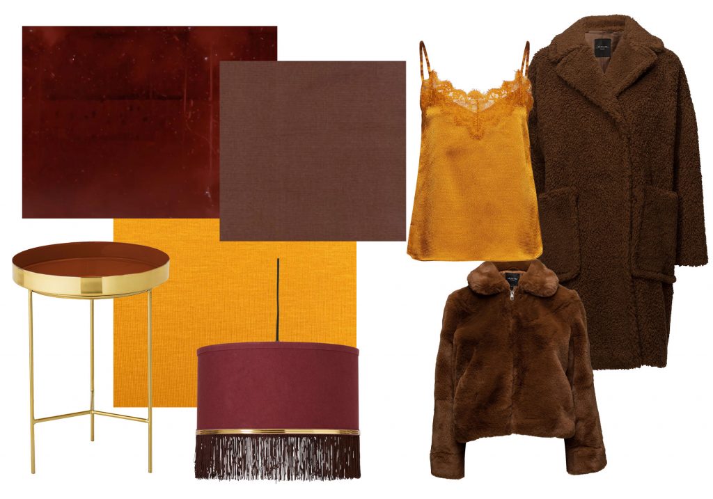 Materialer som velour og silke, gjør seg spesielt godt sammen med disse brente tonene.