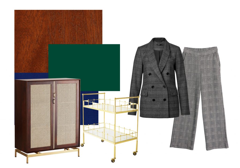 Det er flere elementer som gjør seg gjeldende når det kommer til interiør og dekorasjon. Det er glamorøst og skinnende tilbehør – som for eksempel en bartralle i gull. Fargene som gjelder er mahogni, skogsgrønn og midnattsblå, sammen med materialer som betong og metall. Alt sammen skaper en skreddersøm-stil, der magien ligger i blandingen mellom «støvete» materialer brukt på en delikat måte.