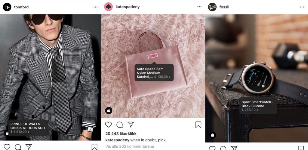 Dersom du har nettbutikk eller selger produkter på nettsiden din, så anbefaler vi å aktivere shopping-funksjonen i Instagram. Det gir deg muligheten til å tagge produkter i bildene dine, og følgerne dine kan trykke på produktene og få de kort presentert mens de fortsatt er inne i Instagram-appen. Derfra legger du inn en URL som gjør at følgerne dine med et klikk kommer direkte inn til produktet på din nettside, noe som gir en kort vei til konvertering.