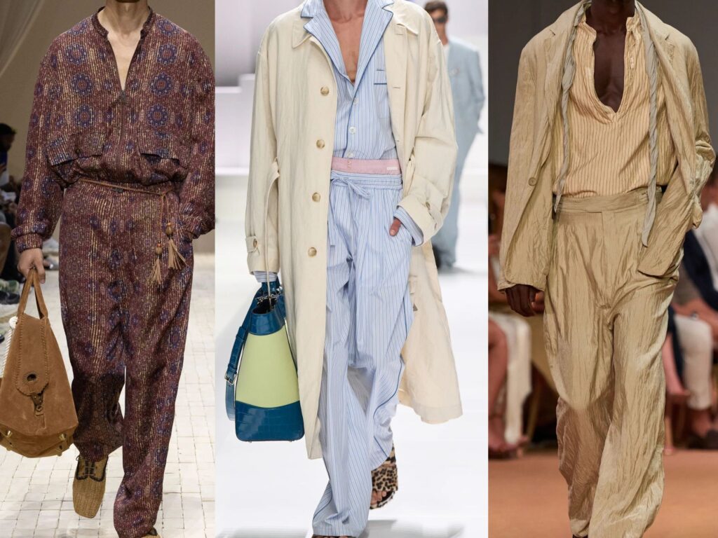 Blanke stoffer på både bukse og skjorte, vide silhuetter, se etter print som striper og sekstitallsfavoritten paisley. Fargekombinasjoner som trender er dus rosa og dyp vinrødt, gråtoner og gyllent gull, grønt og ulike nyanser av beige og muldvarp.