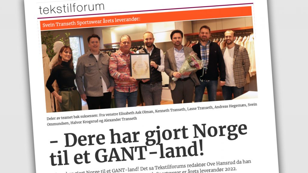 Tekstilforum sendte nylig Svein Transeth Sportswear helt til topps i kåringen av Årets leverandør 2022. – Dere har gjort Norge til et GANT-land, sa Tekstilforums redaktør Ove Hansrud da han overrakte diplomet. Vi ba salgsdirektør Svein Ommundsen beskrive butikkene i GANT-landet Norge.