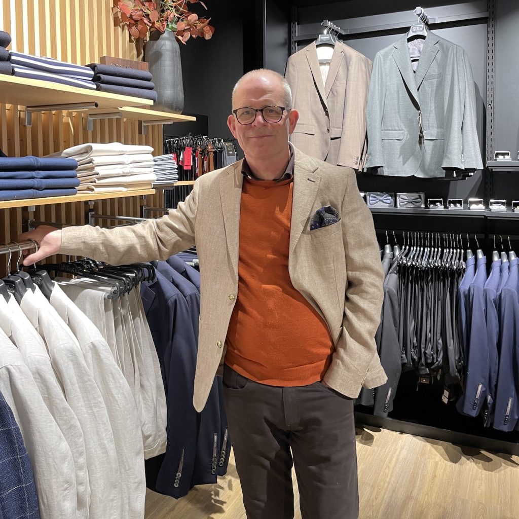 – Du ser jeans til venstre, i enden konfeksjon – og dessuten har vi forskjellige shop-in-shop. Du har en Gant-shop, du har en Tommy Hilfiger-shop, det er en Matinique-shop, du har en Oscar Jacobson-shop. De er på forskjellige steder i butikken, og de ser man veldig tydelig. Jeg liker å ha det ordentlig rundt meg, så her er det ryddige hyller til enhver tid.