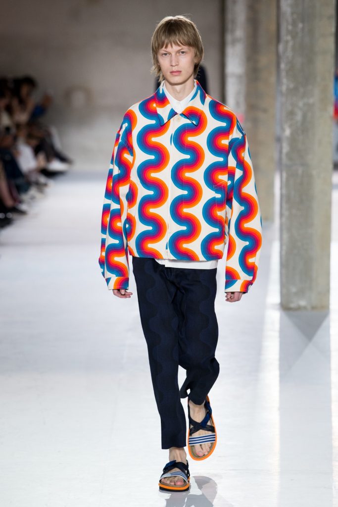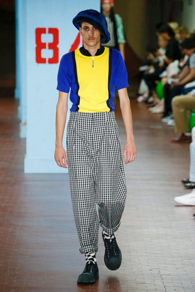Moncler sin vår- og sommerkolleksjon for 2019 var særlig 80’tallspreget på herresiden. Heldekkende mønstre i sterke farger som rødt, hvitt og sort, dekorert på sporty, avslappede plagg som vindjakke og baggy bukser, gir en maksimalistisk og moderne kolleksjon.