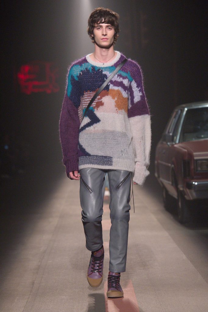 Mykt, fluffy strikk og skinn. Glattere materialer som silke er blandet med tweed og ull. Strikkeplagg står sentralt også her. Det skal være oversized og myke silhuetter – for begge kjønn. Semsket skinn og saueskinn er det mye av til herre, og klassiske t-skjorter av bomull og college. Vi ser også en del fleece. Ikke den vi får kjøpt hos XXL, men den luksuriøse utgaven. Teddy-jakker er også med for vinteren 2019. Materialene blandes selvsagt med hverandre. Myk strikk møter blonder og silke, og vinterfrakker i ull eller semsket materialer, mikses med ullbusker – særlig til herre.