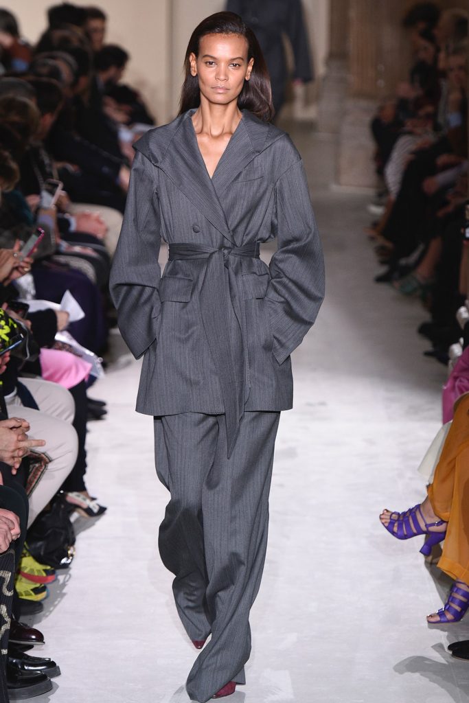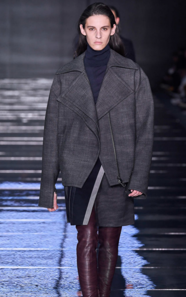 Max Mara viste en helsort og grå kolleksjon full av lakk, lær, krokodilleskinn og grov tweed, med feminine turtlenecks og miniskjørt, oversized kåper, stramme dressjakker og løse bukser.