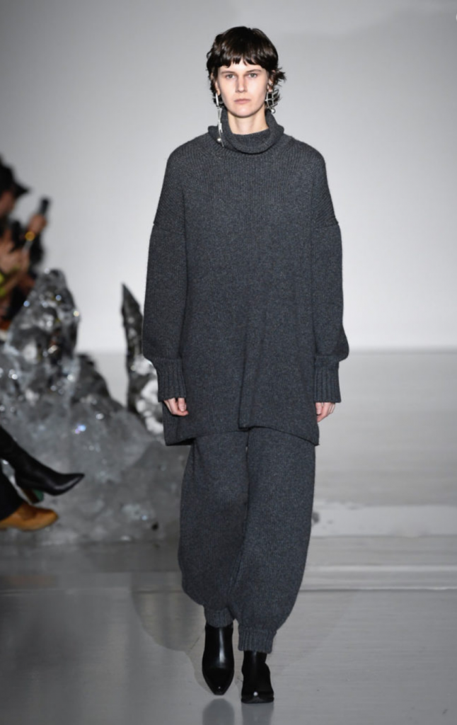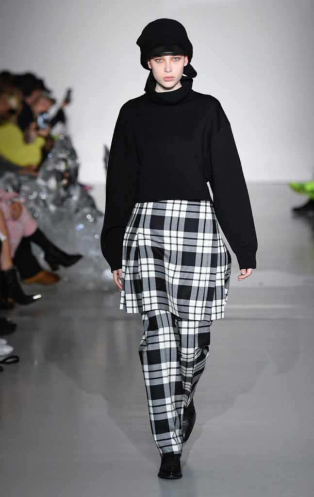 Pringle of Scotland viste en kolleksjon med sentrale tendenser for ny minimalisme til AW19-sesongen, med helhvite antrekk, store ruter i sort-hvitt, grafiske mønstre i sort-hvitt, trendy argyleruter med store kontraster, og helgrå antrekk i strikk. Herrekolleksjonen var full av gråtoner og argyleruter med innslag av signalgult.