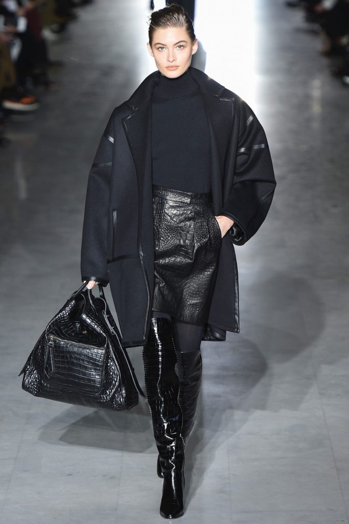Tom Ford sin høstkolleksjon var ren og stilig, og full av materialmiks med sateng, fløyel og skinn fra topp til tå, med smale og løse silhuetter i helgrått, sort og hvitt.