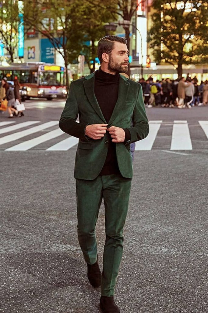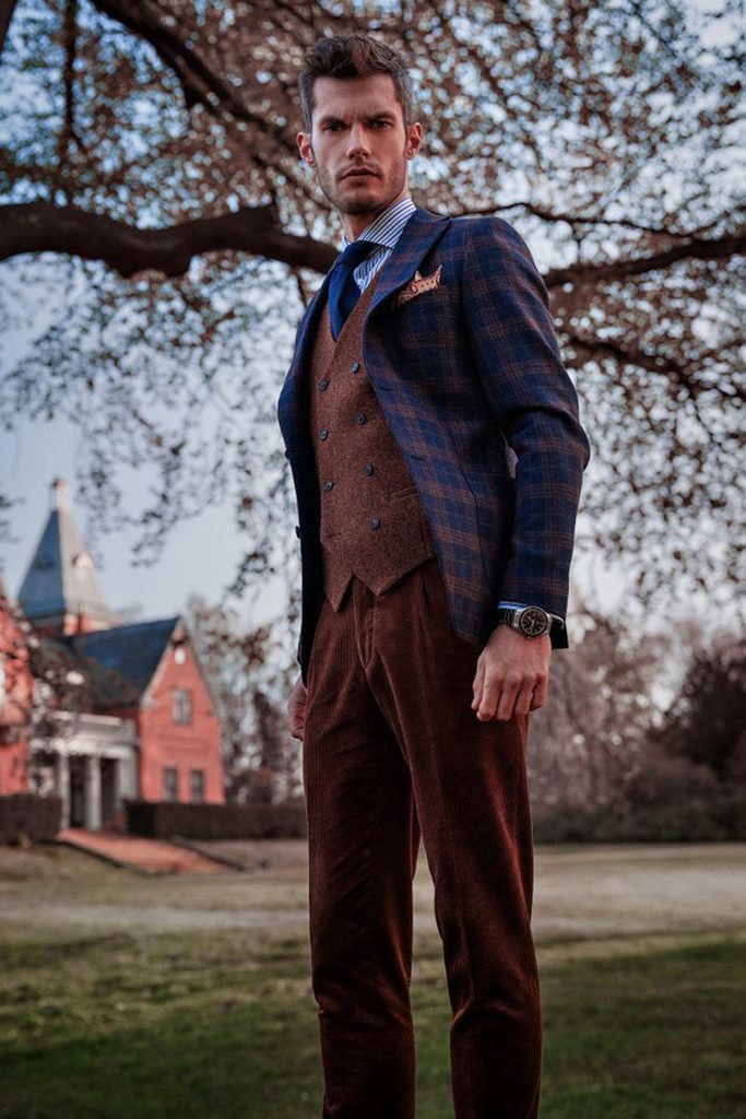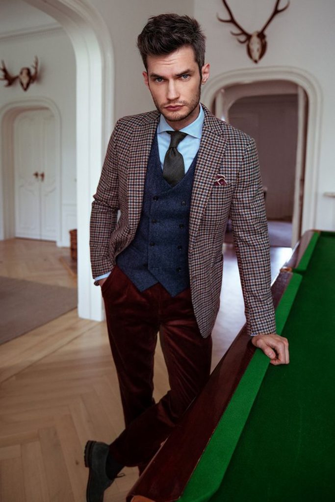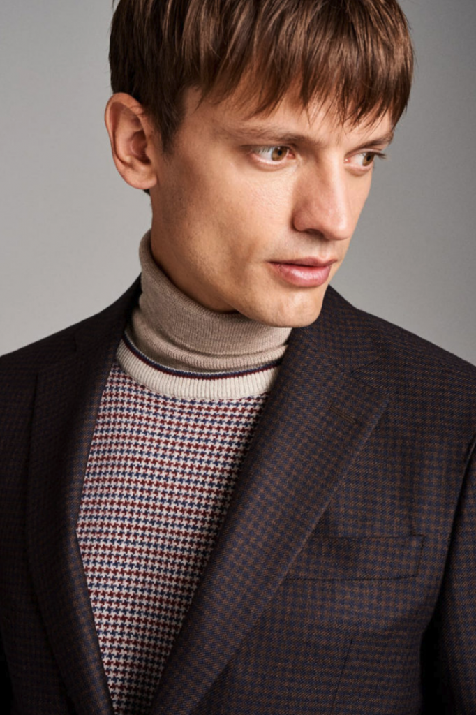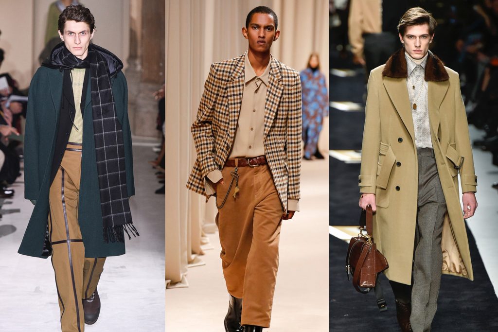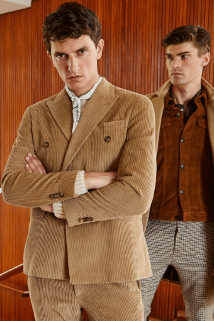 Blant denne trendens nøkkeplagg til ham finner en særlig den dobbeltspente dressen, i tillegg til smale dresser med press i benet. Skjortene skal helst ha spisse 70-tallskrager, og må gjerne matches med en genser med rund hals over, slik at kragen stikker frem. Den høyhalsede genseren vil også fortsette å være populær, både turtleneck og rollerneck blir sentralt her.