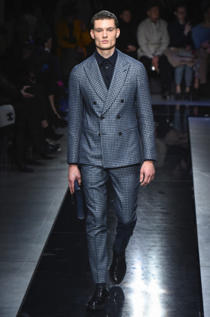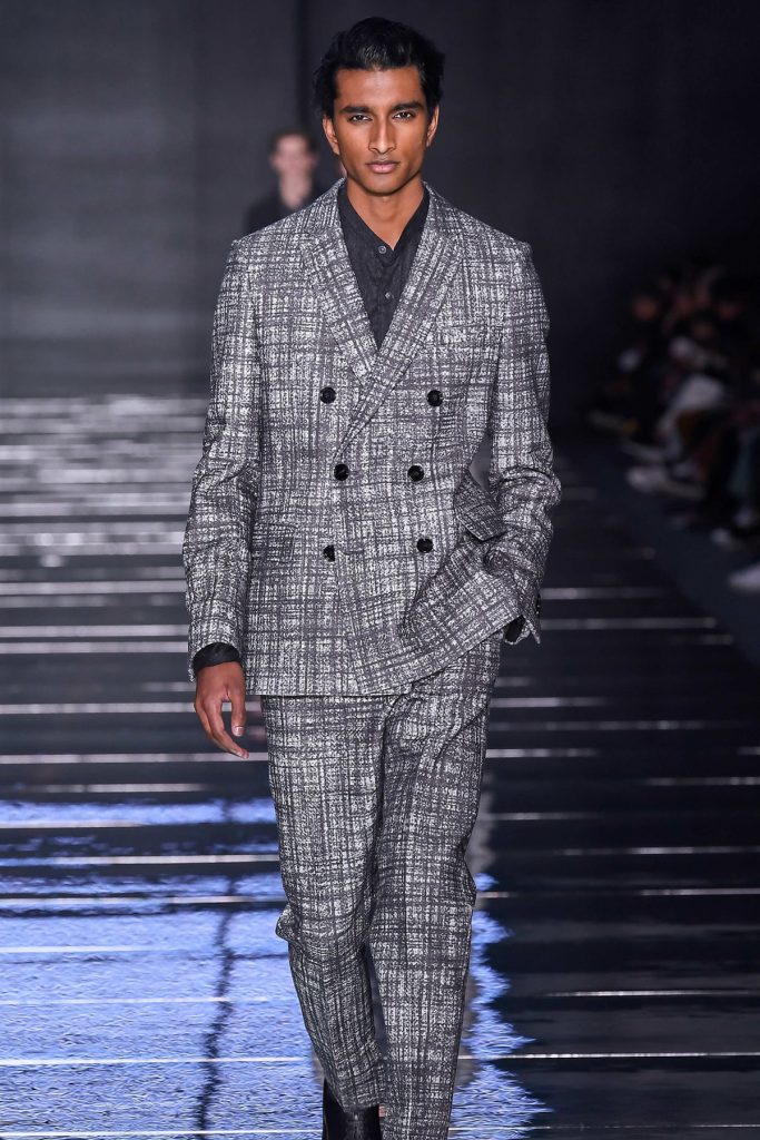 Giorgio Armani bød på en elegant og tradisjonell AW19-kolleksjon med smale og løse smårutete dresser, dobbeltspente jakker, løse snitt på bukser og mye hundetannmønster i en grå, blå og nedtonet palett.