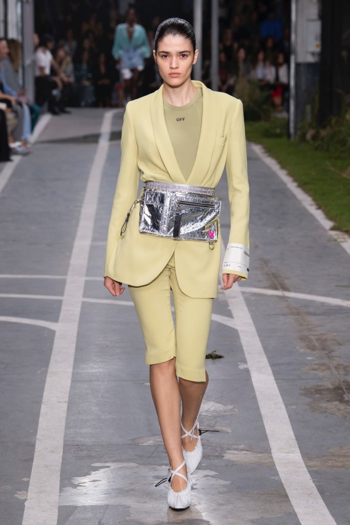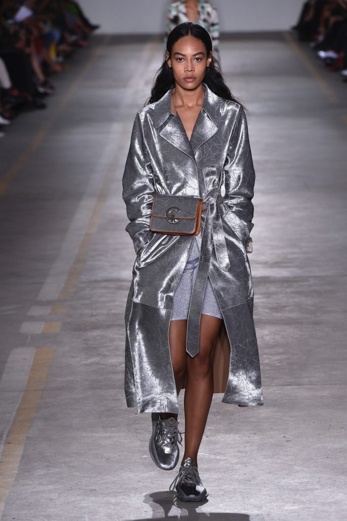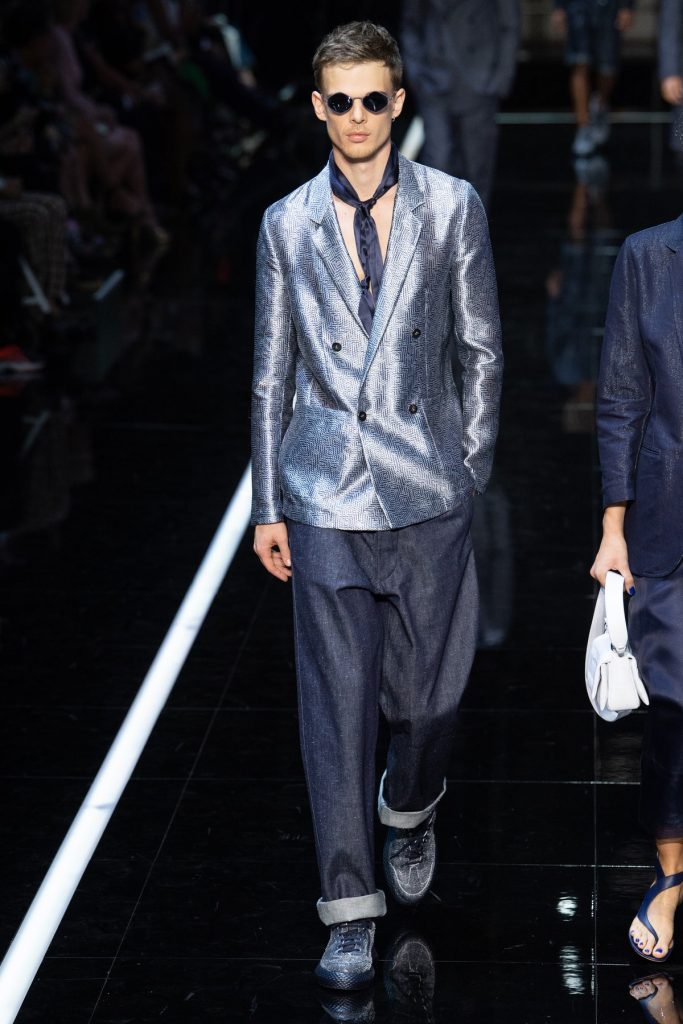 Emporio Armani hadde også latt seg inspirere av futurismen og tech i sin vår- og sommerkolleksjon for 2019, med blanke, metalliske materialer og små mønster på tilkneppede, stramme plagg, kombinert med løse, silhuetter som baggy bukser.