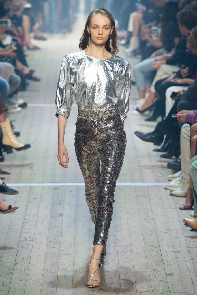 Isabel Marant vår- og sommer for 2019 viste en gjeng med futuristiske amasoner ikledd blant annet sølv, metall og paljetter fra topp til tå. Overdelene var puffy og store i fasongen som ga et sterkt statement, samtidig som de lot tankene vandre til 80-tallet med kraftige skuldre. Buksene var høye på livet og smale nederst på beinene.