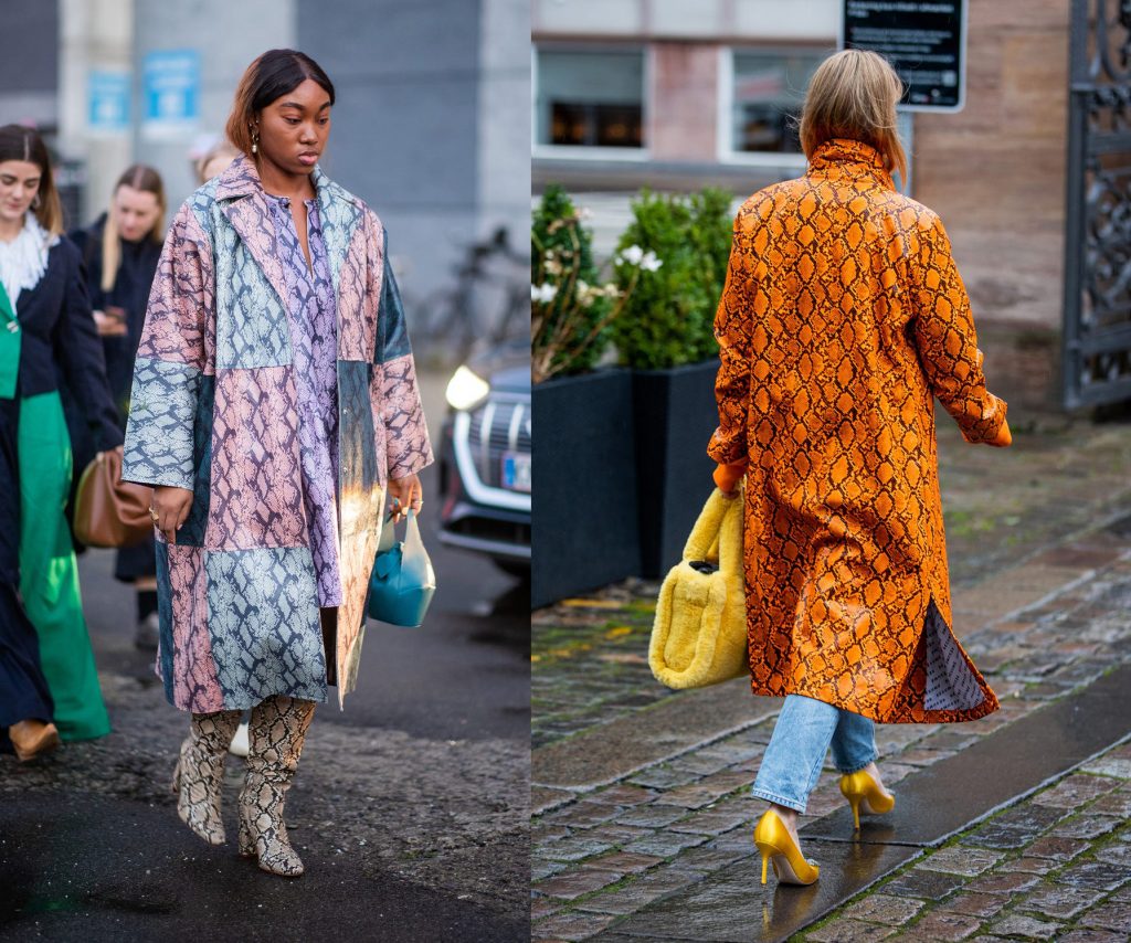 Helt siden våren 2019 har dyriske detaljer som krokodille- og slangeskinn sakte, men sikkert sneket seg inn i motebildet. Først og fremst som tilbehør i form av sko og vesker. For vinteren 2020/2021 er det særlig slangeskinn i naturfarger, pasteller, knallfarger og leopard, men også kuskinn og sebramønster som vil bli sentralt. Disse kommer som detaljer på støvletter, sko og vesker, men også på kåper og jakker.