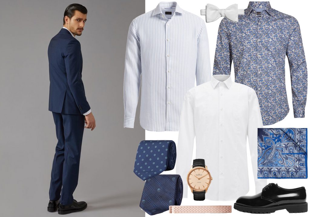 Ønsker du et mer avslappet og lekent uttrykk, kan du gå for en skjorte med for eksempel blomstermønster eller paisleymønster. Denne kan også styles med et ensfarget blått slips, eller en hvit sløyfe.