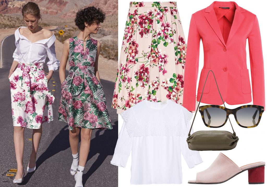 BLOMSTERDRØM: Skjørt fra Hallhuber, bluse fra Sandro, blazer fra Max Mara, sko fra Selected Femme, solbriller fra Tom Ford, veske fra Marimekko. Foto: Kampanjebilde fra Hallhuber